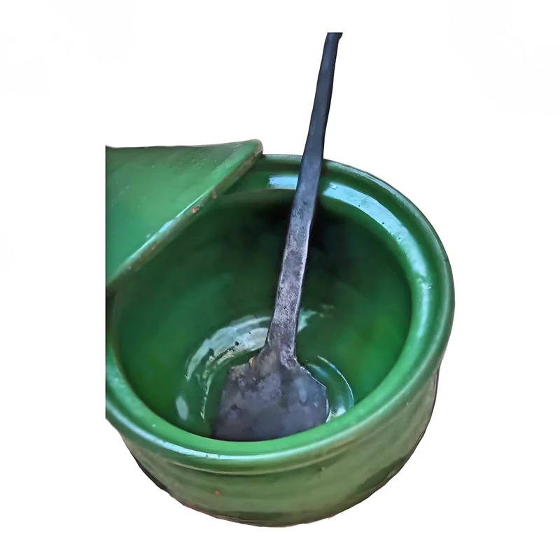 این کفگیر آهنی، چکش خورده و داخل کوره رفته است؛ مقدار قابل توجهی آهن یونیزهٔ آمادهٔ جذب برای بدن در هنگام پخت غذا آزاد میکند و مقدار قابل توجهی آهن به غذا میدهد.