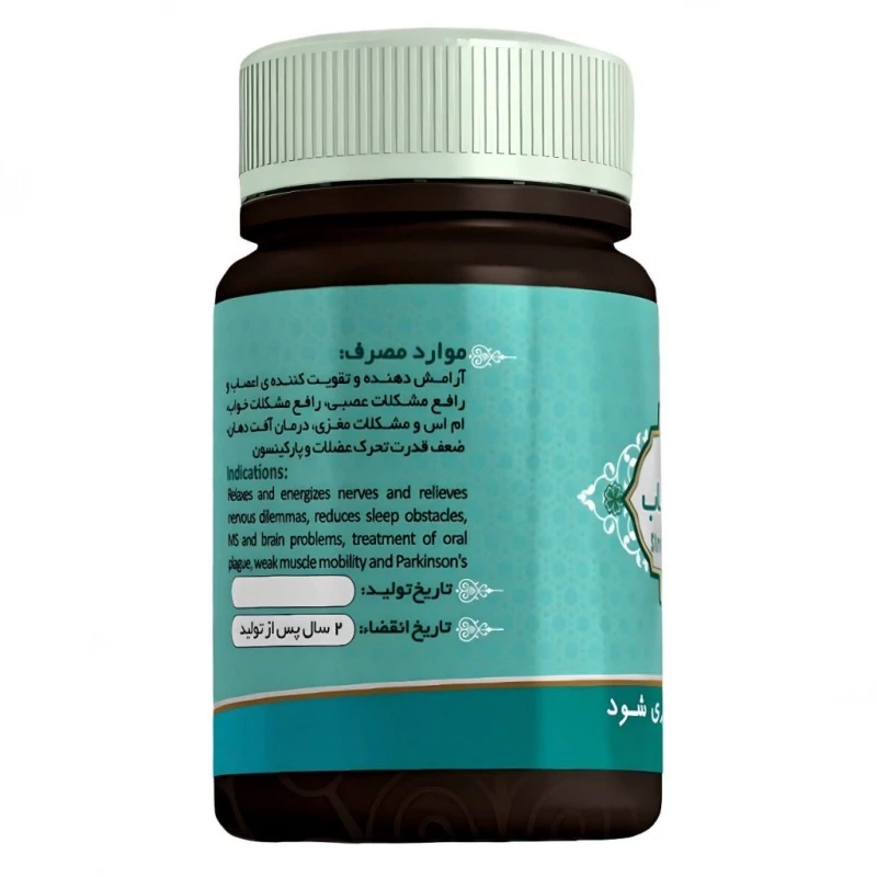 بهبود کننده مشکلات اعصاب و روان تقویت کننده عروق عصبی و نخاعی تقویت و اصلاح کننده اعصاب و روان پاکسازی و جارو کننده مغز از فضولات بهبود افسردگی بهبود عصبانیت های شدید کمک به بهبود ام اس و پارکینسون کمک به بهبود کم کاری تیروئید بهبود سردردهای میگرنی آرامش دهنده و خوابآور کمک به بهبود تشنج و صرع کمک به بهبود وسواس فکری و عملی کمک به بهبود دوقطبی کمک به بهبود رعشههای عصبی رافع اضطراب، دلشوره و استرس کمک به بهبود بدبینی بهبود منفی بافی کمک به بهبود بیماریهای غلبه سودا کمک به بهبود بیش فعالی بهبود عدم تمرکز بهبود ترسهای شدید بهبود توهم و خیال بافی و... مقدار مصرف دارو: - بزرگسالان: هر صبح و شب دو حب (این مقدار مصرف را تا دو برابر در هر وعده بر اساس نیاز فرد میتوان بالا برد) - خردسالان (زیر 5 سال): هر صبح و شب یک حب ملاحظات: بهتر است در طول بهبود با این دارو، مصرف روغنیجات و سرخ کردنی، شیرینی جات صنعتی، غذاهای تند و شور و محصولات و اسانسهای صنعتی، تنقلات مصنوعی، فست فود، انواع مواد خمیری و حجیم مانند ماکارونی هر چقدر میتوانید کم شود. عوارض دارو: به خاطر آرامش دهندگی خوابآور میباشد لذا مواقع رانندگی استفاده نشود. تداخل دارویی: ندارد. ممنوعات دارویی: به خاطر خوابآور بودن سعی شود قبل از رانندگی مصرف نشود. محل و دمای نگهداری: بهتر است در جای خشک و خنک نگهداری شود.