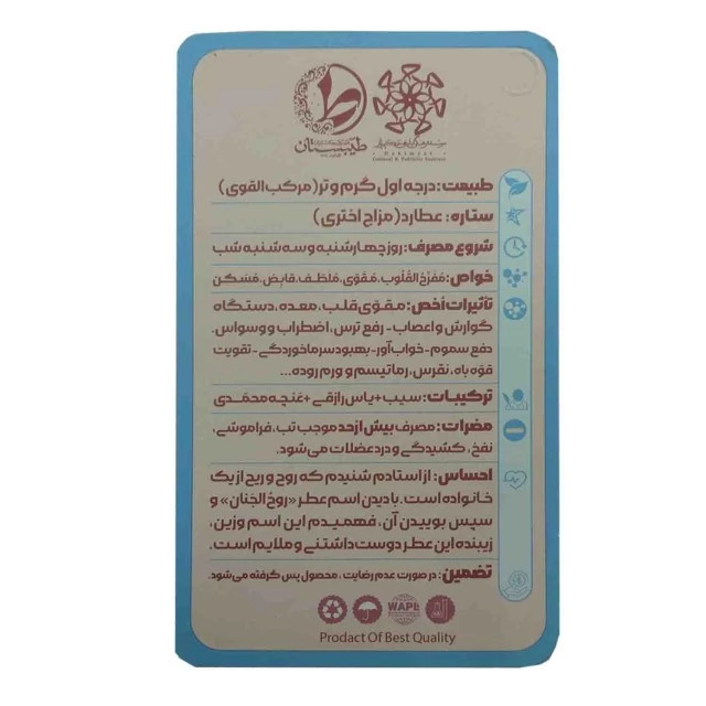 رایحهای گیاهی، تلخ و معنوی با طبع گرم و تر مرکبالقوی که حس آرامش، تمرکز و نشاط درونی را در فضای شخصی یا عمومی منتشر میکند. این عطر بر پایهٔ آموزههای رایحهدرمانی حکمتبنیان شرکت طیبستان تهیه شده و از ترکیب گل یاس رازقی، سیب، غنچه محمدی و صمغهای طبیعی فرآوری شده است 2 . ویژگیهای درمانی و کاربردی: تقویت قلب، معده، دستگاه گوارش و اعصاب رفع ترس، اضطراب، وسواس و بیقراری خوابآور، ضد سموم و بهبود سرماخوردگی مؤثر در درمان نقرس، رماتیسم و ورم روده نکات ویژه: مزاج اختری: عطارد