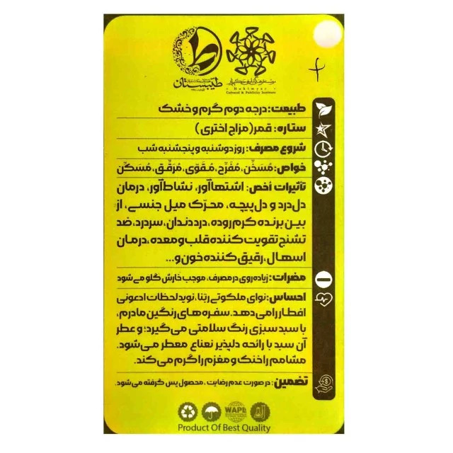 این عطر با رایحهای تند، خنک و محرک از نعناع فلفلی، پرتقال و لیمو تهیه شده و بر پایهٔ حکمت بنیان طراحی شده است. طبع آن درجه دوم گرم و خشک است و برای رایحهدرمانی، تقویت قوای ذهنی و پاکسازی بدن بسیار توصیه میشود. خواص درمانی و کاربردها: نشاطآور، اشتهاآور و تقویتکننده قلب و مغز تسکین دردهای گوارشی، دلدرد، دلپیچه و اسهال ضد تشنج، ضد کرم روده و تقویت قوای جنسی خنککننده مشام، مؤثر در رفع خستگی ذهنی و افزایش تمرکز آرامبخش و ضد افسردگی در رایحهدرمانی