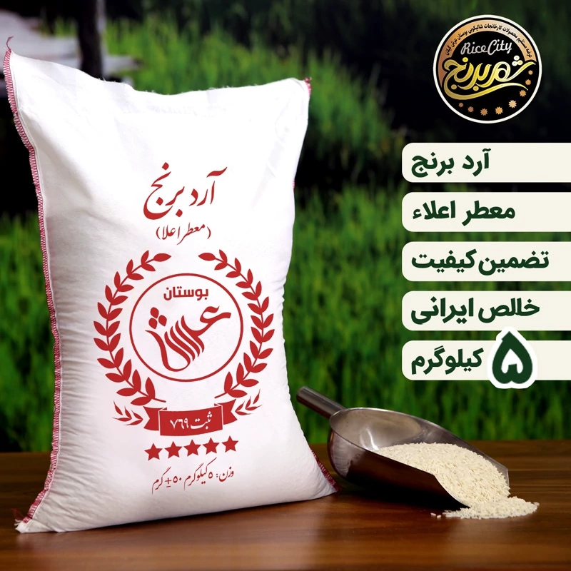 آرد برنج معطر اعلا کیفیت و طعم عالی تمیز کیسه 5 کیلویی "تضمین کیفیت فروش مستقیم از کارخانه شالی کوبی بوستان عرش تالش (دفتر مرکزی قم)
